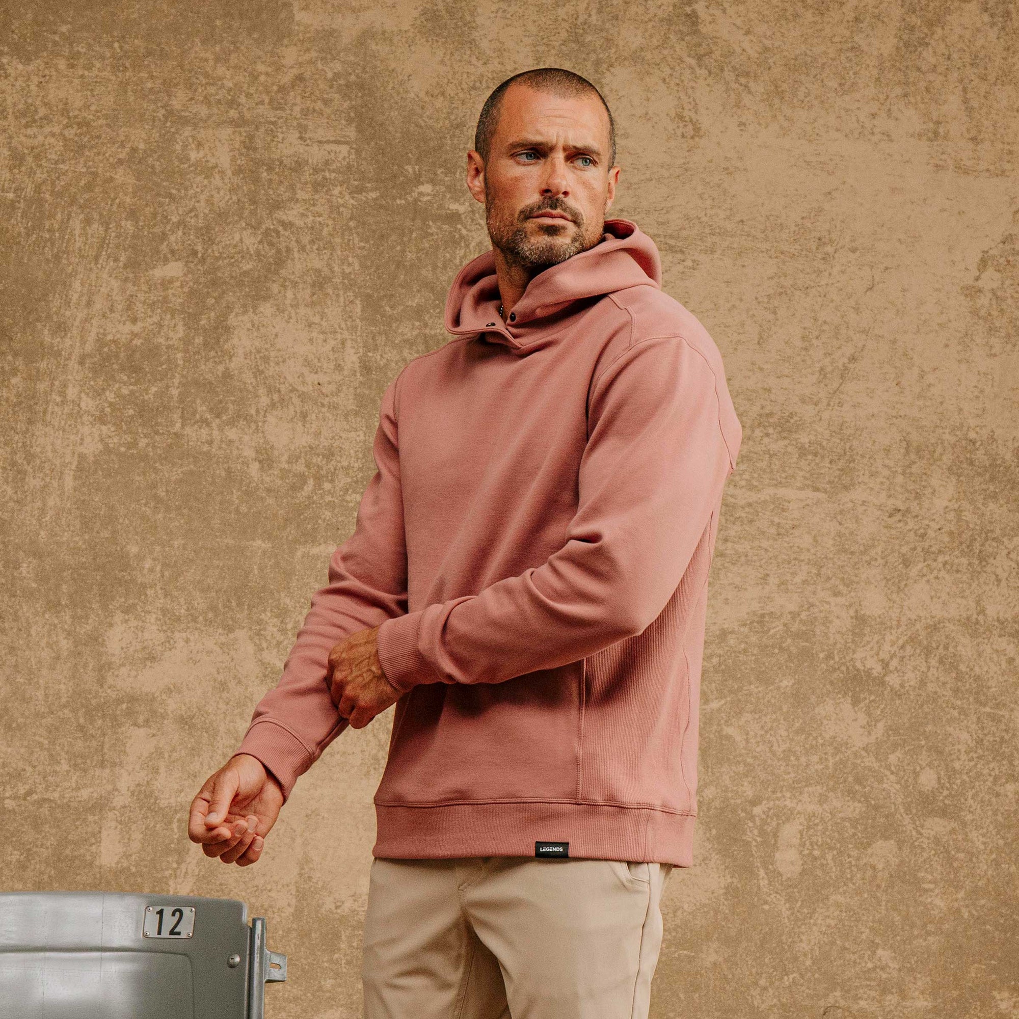 Mid-weight cotton blend knit with anti-microbial fabric. Rib-side panel for mobility and a double button collar on the hood.