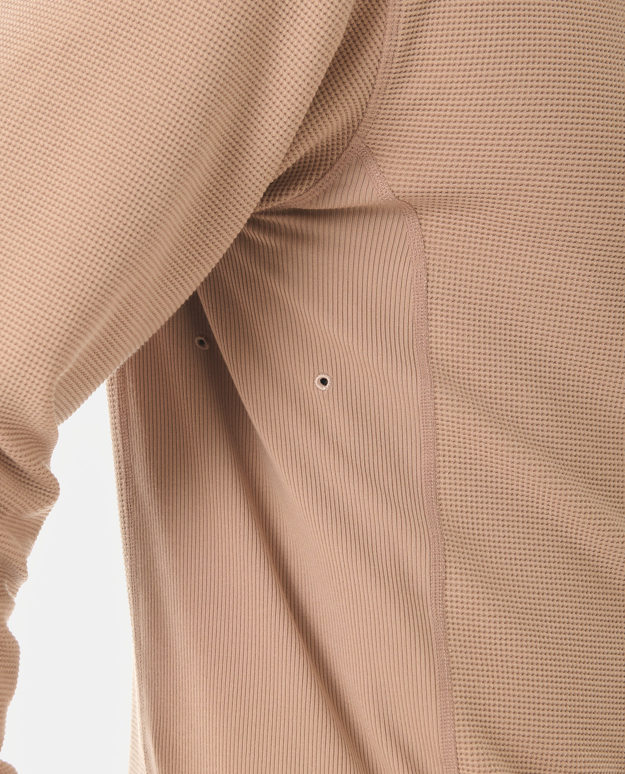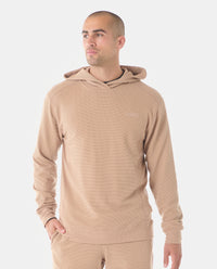 Upgrade your casual wardrobe with the Glen Waffle-Knit Hoodie, a timeless essential designed for all-day comfort. Made from textured waffle-knit fabric, this hoodie features a crossover hood and ribbed side panels for a sleek, modern fit. The coverstitch details and new embroidered rhombus patch branding add just the right amount of sophistication, making it the perfect piece to wear at home or on the go.