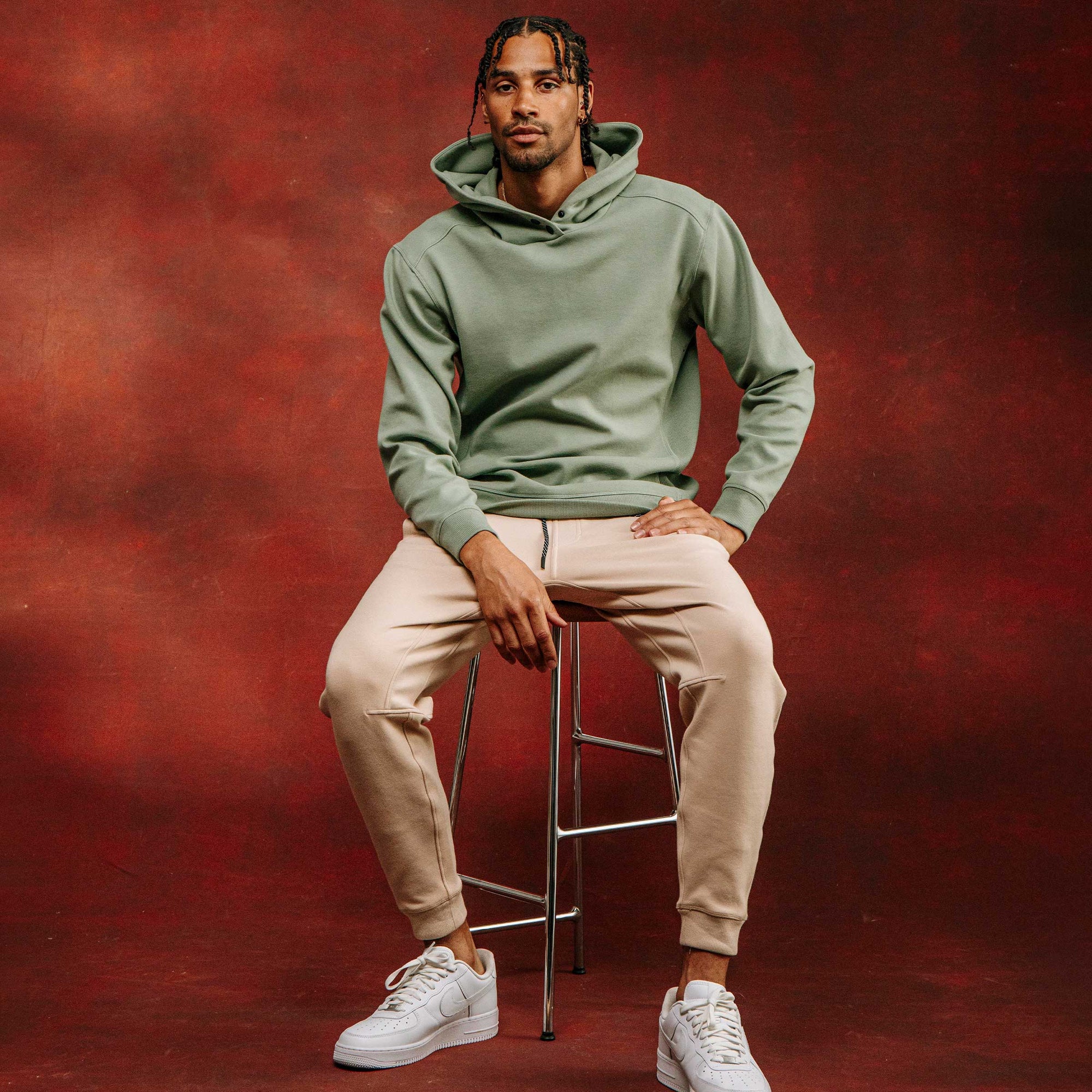 Mid-weight cotton blend knit with anti-microbial fabric. Rib waistband with optional drawcord, rib side panel, and an invisible back pocket zipper.