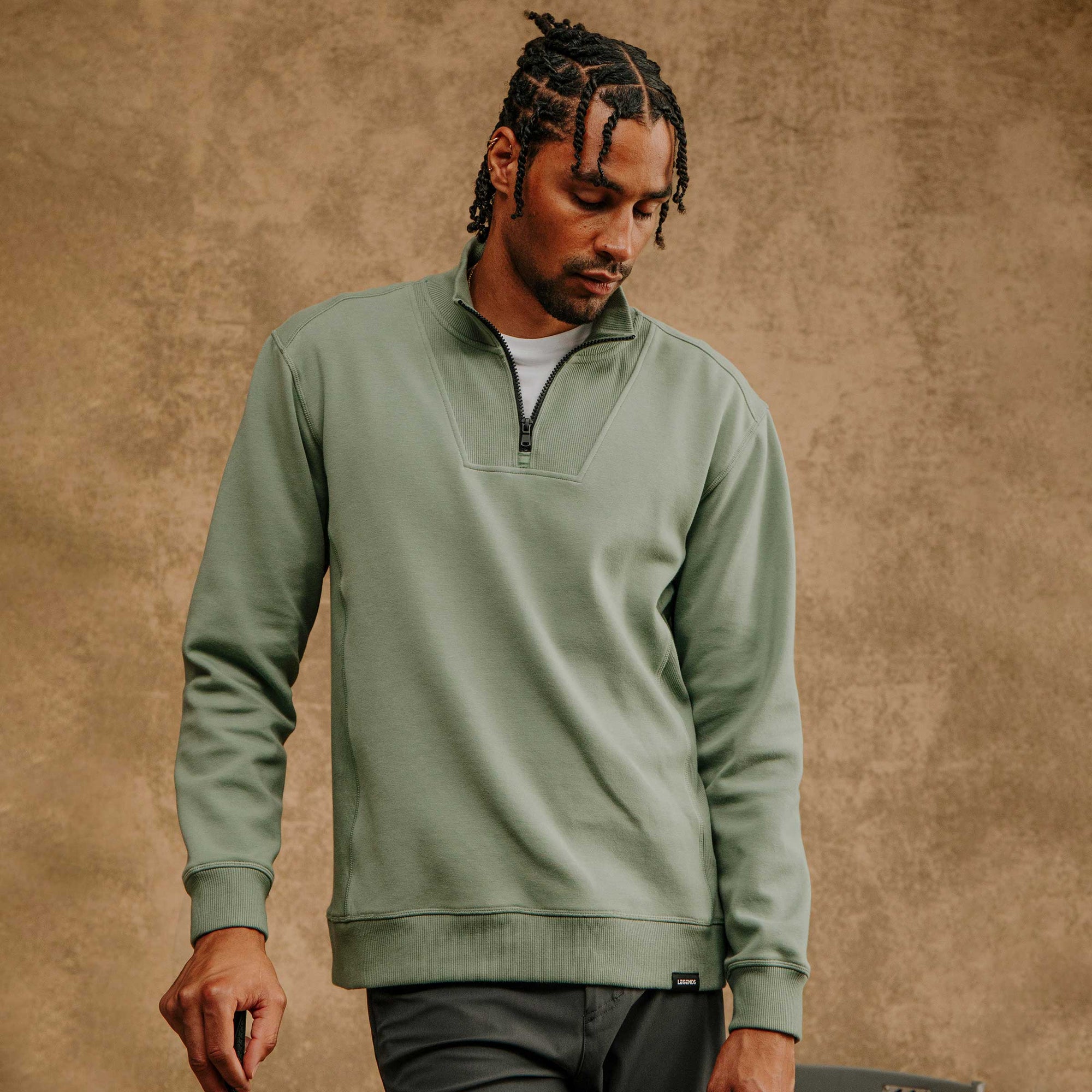 Mid-weight cotton knit quarter zip with a rib-side panel for mobility and a clean tapered collar area for the zipper.